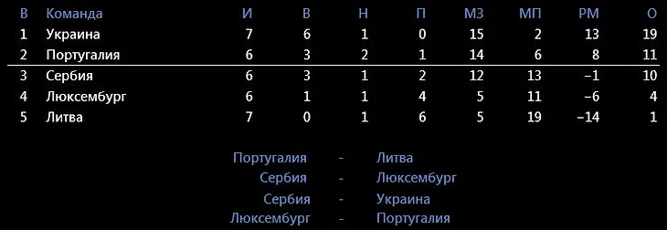 Украина себе обеспечила первое место в группе, но мотивацию потерять не должна. Очень близко первая корзина посева на Евро. Сербия, конечно, захочет поквитаться за 0-5 с Украиной, но не факт, что им хватит организации в командной игре против парней Шевченко. Португалия должна без сюрпризов брать 6 очков и квалифицироваться.