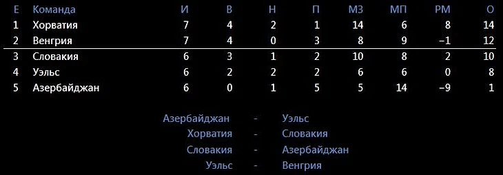 Запутанная группа. Уэльс со скрипом забивает мячи, но с помощью гипермотивации должен побеждать Азербайджан в гостях. Хорватам, чтобы обезопасить себя, достаточно ничьи, но для Словакии ничья и поражение равнозначны, из-за того, что Уэльс имеет преимущество личных встреч над ними при возможном равенстве очков. Словакам логично играть с хорватами рискованно. Если удастся, то победа дома в последнем туре принесет первое место в группе. Если не выиграют, то придется ждать результатов матча Уэльс-Венгрия. Победа любого из соперников выводит его на Евро, ничья в пользу Словакии. Поскольку у Словакии преимущество личных встреч над Венгрией при возможном равенстве очков. Т.о Уэльсу нужны две победы, Венгрии одна, но в гостях, а у Словакии есть варианты.
