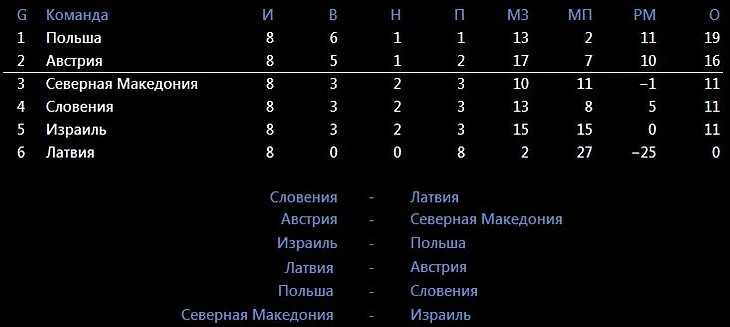 Теоретически 5 команд продолжает претендовать на Евро. Реально, любая победа Австрии, к примеру, над Македонией, интригу умножит на ноль. Из трех оставшихся за бортом команд только у Словении нет запасного парашюта под названием Лига наций, и даже 6 очков не помогут им попасть на турнир, при любой ничьей Австрии. У Австрии хороший календарь, но занять первое место непросто, ведь у Польши преимущество личных встреч над ними, при возможном равенстве очков, да и мотивация попасть в первую корзину жеребьевки Евро присутствует.