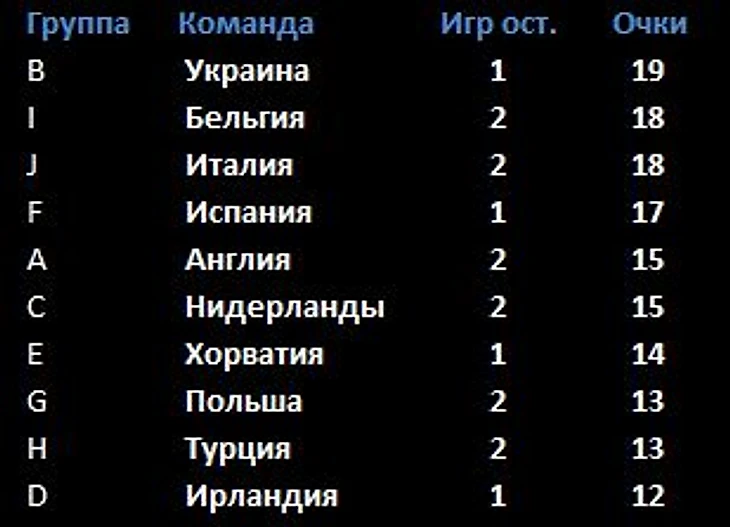 3. Если, вдруг, Россия обходит Бельгию. С 21-м очком Россия проходит в первую корзину, обходя Испанию. Если во второй корзине окажутся Германия, Англия, Нидерланды и Украина они не смогут попасть к нам, но Бельгия опять вполне реальный соперник, как вариант, уже из второй корзины.