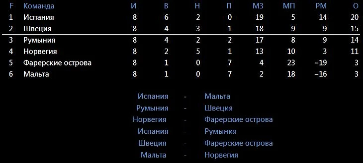 У Норвегии легкий график, но даже 6 очков не хватит, если шведы возьмут запланированные очки против Фарерских о-вов. В теории Швецию еще может обойти Румыния, но для этого нужно выигрывать обоих лидеров группы или делать ничью с Испанией, а Швецию побеждать с определенным счетом. Но Испания претендует на первую корзину посева на Евро и в домашних матчах очки отдавать совсем не собирается.