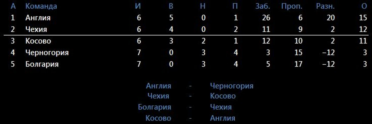 Прогноз Англия 1 место, Чехия 2 место.