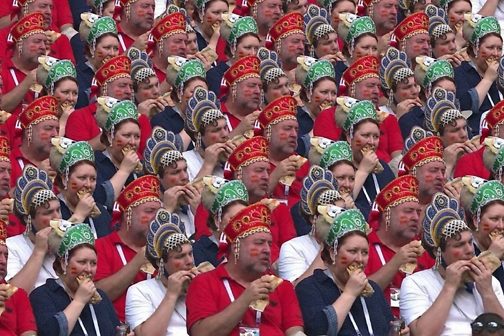 Легендарное трио, жующее на трибунах во время матча Чемпионата мира Россия-Испания было бы гораздо выше в этом рейтинге, если бы не одно но. Несмотря на то, что многие СМИ написали о том, что люди в кокошниках ели шаурму, это были всего лишь бутерброды. Шаурмы в продаже на стадионах ЧМ не было (зато был культовый десерт – тульский пряник).