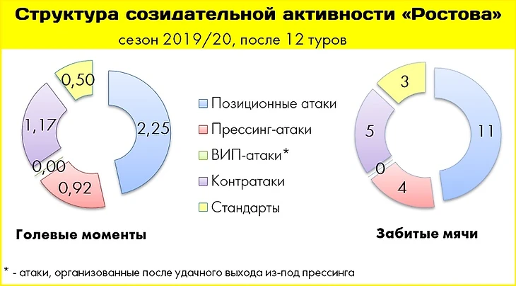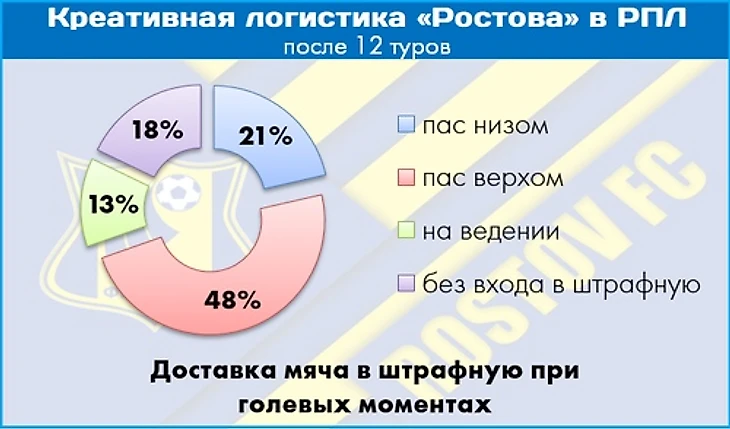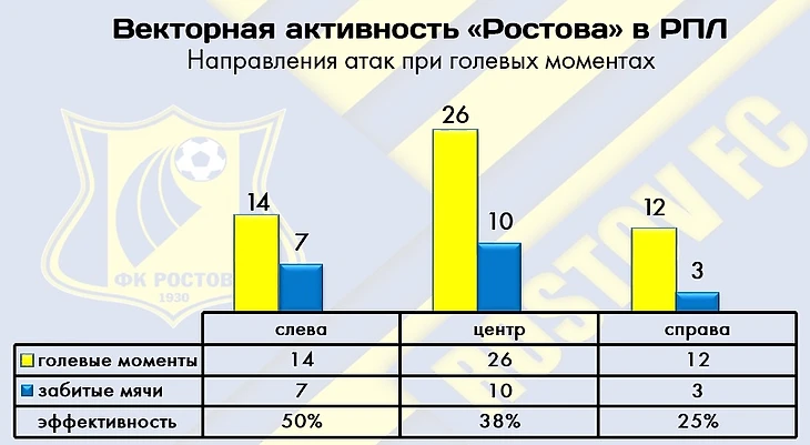 Векторный баланс в атаке у ростовчан тоже соблюдается, и через фланги команда Карпина создает и забивает столько же, сколько и в лобовых атаках через центральную зону (и в этом плане прослеживается явное сходство с «Зенитом»).