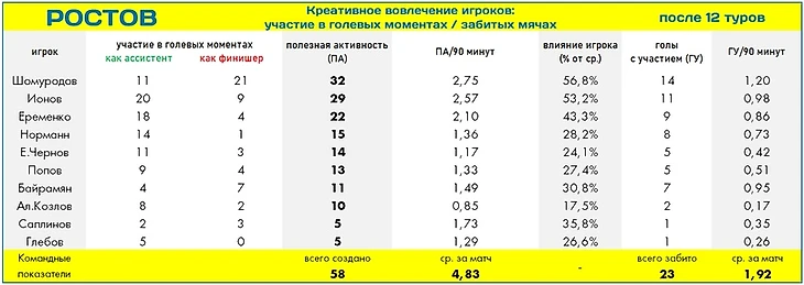 Количество переходит в качество благодаря убийственной эффективности Шомуродова (21 момент/10 голов – 48% реализации), и за 12 туров ростовчане ухитрились забить после игровых комбинаций уже на два мяча больше, чем за весь прошлый чемпионат (19 голов против 17).
