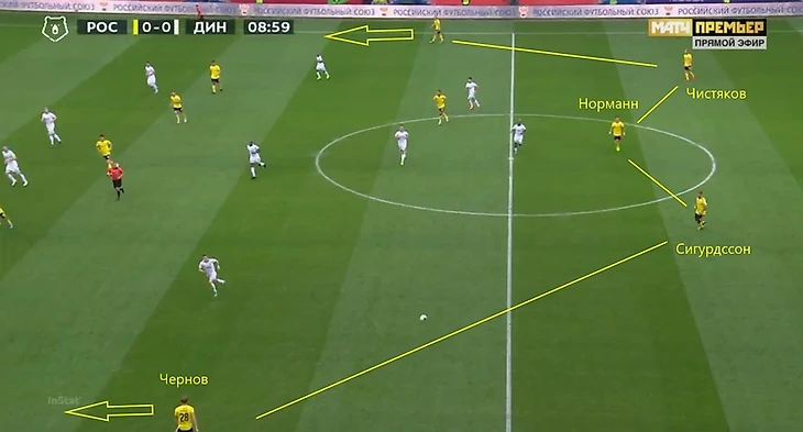 В то же время Норманн выполняет функции нижнего страхующего (временами ростовчане перестраиваются при обороне из 4-3-3 в 4-1-4-1, откатываясь в низкий блок), а при начале своих атак опускается почти в линию к центрдефам для розыгрыша, что позволяет крайним защитникам подниматься достаточно высоко и растягивать оборону соперника.
