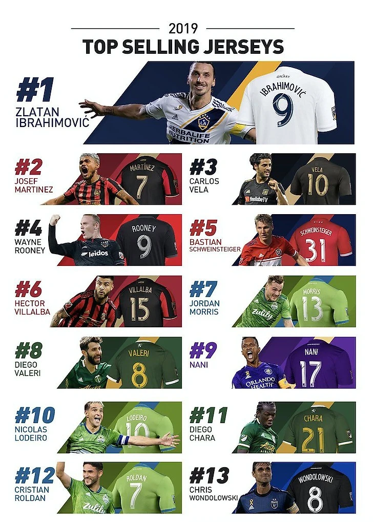 МЛС выкатила статистику, посвященную главному индикатору популярности футболистов – продажам футболок. С первым местом все предсказуемо – Златан покоряет Калифорнию. С популярностью Ибры может посоперничать только Бекхэм.