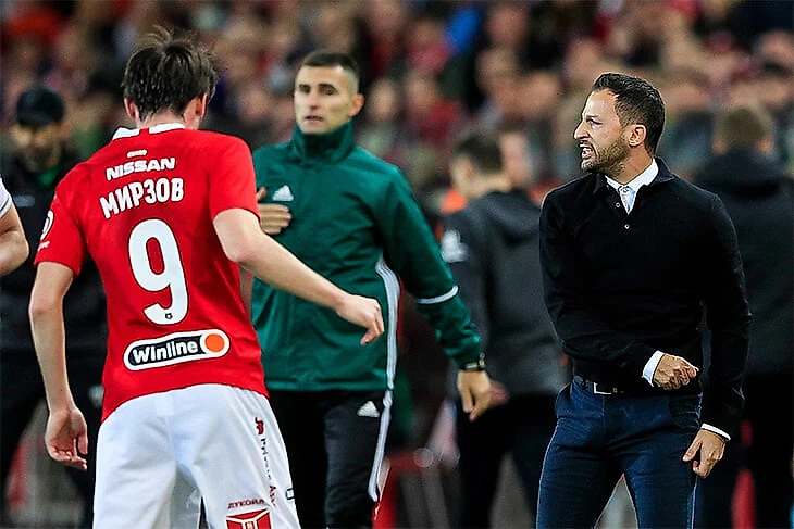 Весь первый тайм Тедеско не садился на скамейку, постоянно требовал от защитников идти выше, а от нападающих – прессинговать. На пресс-конференции он объяснил, что разный «Спартак» в первом и втором тайме – вопрос прессинга. Игра стала получаться лучше, когда центральных защитников начали встречать не Шюррле и Мельгерехо, а Умяров и Бакаев.