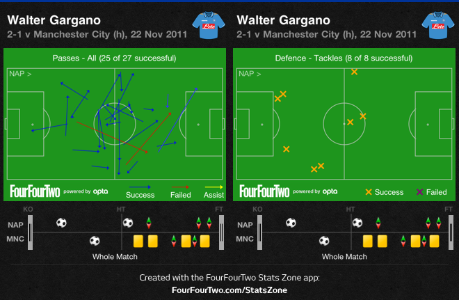 Балотелли был единственным игроком, способным что-то изменить - Кристиан Маггио зачастую был перегружен за счет подключений вперед Коларова и возможных смещений в центр неприкрытого Балотелли - понаблюдайте за тем, как он с фланга прибежал на ту позицию, с которой впоследствии забил; отметим, что у "Наполи" не было свободного игрока для того, чтобы за ним присматривать.
