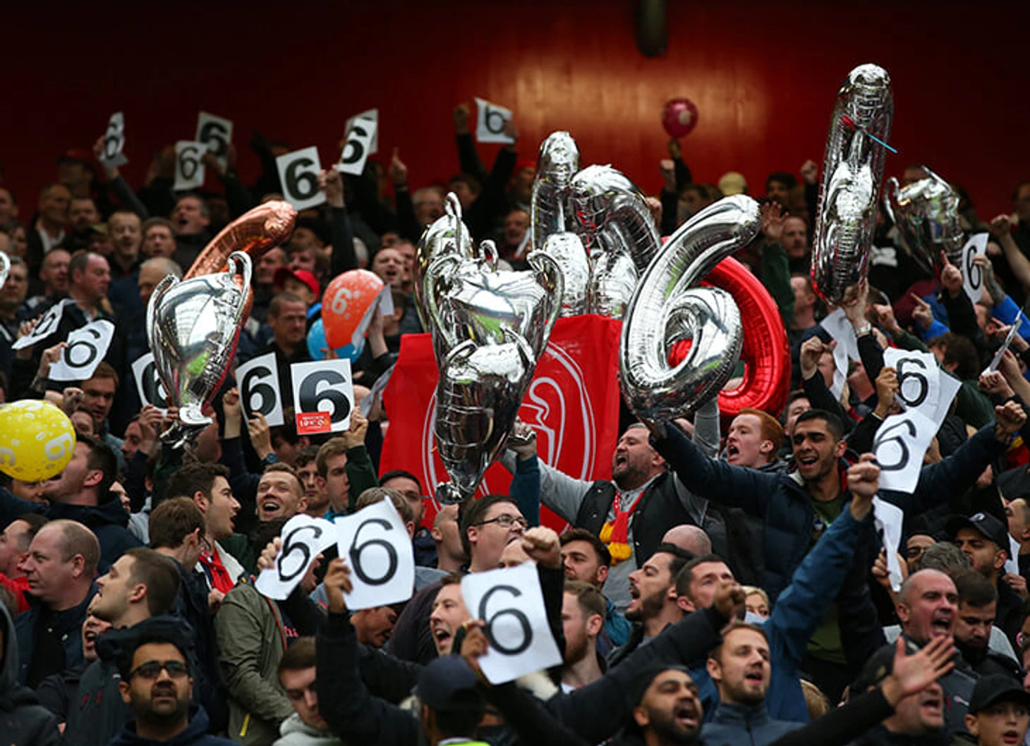 Фанаты «Ливерпуля» тоже подготовились к принципиальному матчу. На гостевой сектор они протащили воздушные шары в форме цифры 6 и кубка Лиги чемпионов. Перед стартовым свистком почти каждый болельщик еще и поднял над головой бумажку с шестеркой.