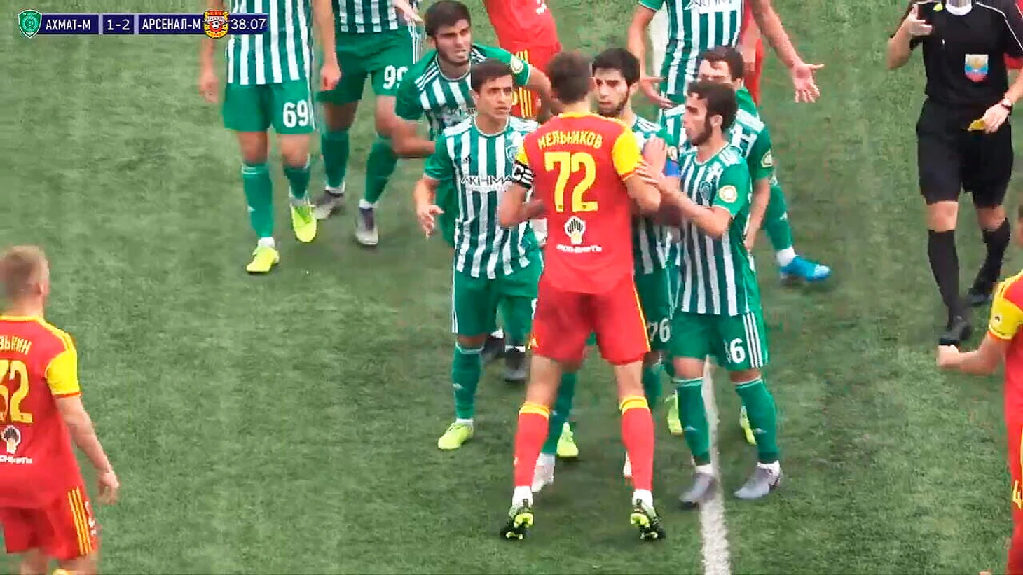 После этого три игрока «Ахмата» набросились на кэпа «Арсенала» Никиту Мельникова, который оказался рядом. Один из грозненцев ударил соперника по лицу. С трибун в этот момент уже полетело: «Проститутки ###### (нехорошие)!».