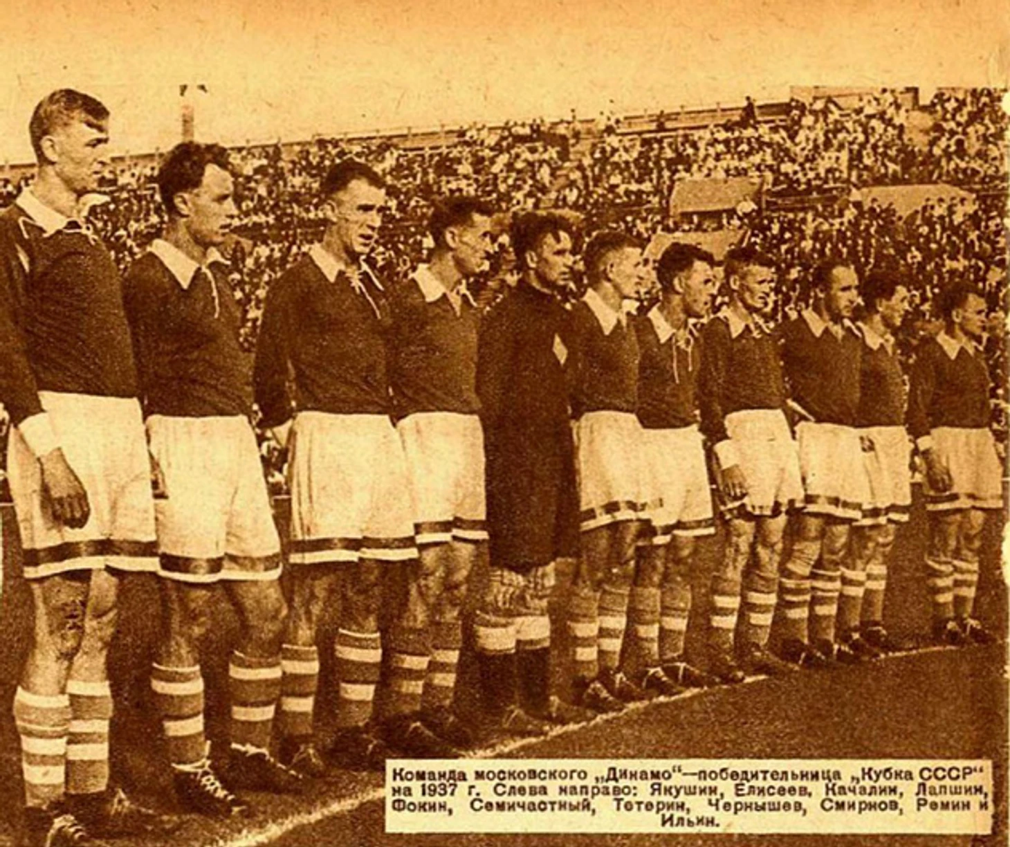 Динамо-1937. Стоят: С.Ильин, М.Якушин, А.Лапшин, В.Смирнов, Г.Качалин, М.Семичастный, А.Рёмин, Е.Елисеев, В.И.Дубинин. Сидят: Л.Корчебоков, Е.Фокин, А.Мышляев.