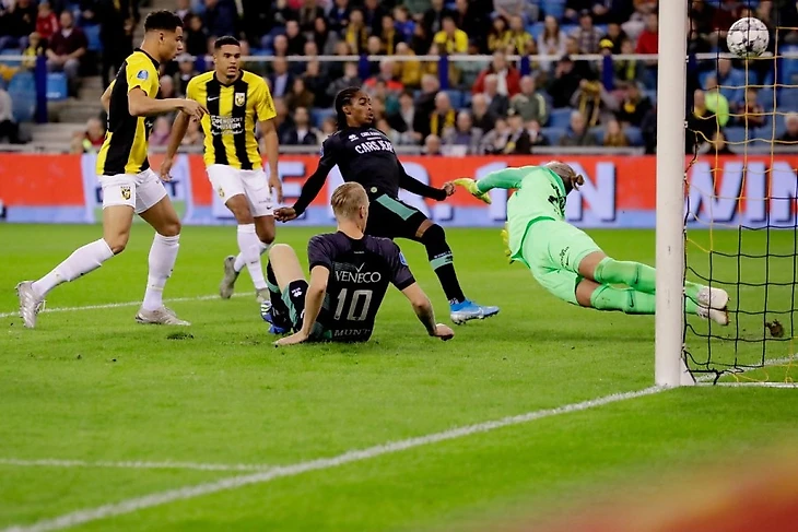 Дальнейший сценарий матча был предельно ясен - "Адо" запрется в своей трети и будет уповать на контратаки, а "Витесс" постарается взломать оборону через позиционное нападение. И здесь обнажились проблемы команды Леонида Викторовича - по сути, все построение атак сводилось к подготовительным передачам на фланг и следовал навес ( особенно был задействован левый фланг в лице Кларка ). Но и этот способ доставки мяча в штрафную работал с перебоями - в большинстве своём удачно действовала оборона гостей. Стоит отметить и её - Алфонс Грунендейк выставил 4-1-4-1 без мяча, где шестёрка Данни Баккер страховал пространство за спинами восьмёрок Госсенса и Иммерса, а крайние нападающие Хой и Саммервилл садились в линию обороны, фактически формируя 6-3-1, все это происходило в своей трети. Удачные навесы "орлов" либо шли мимо, либо не не представляли опасности для голкипера. По итогам первого тайма оба голевых момента случились в нетипичных ситуациях - Матавж мог забить после розыгрыша аута ( защитник вынес мяч с ленточки ворот ), Дико бил из штрафной после флангового розыгрыша.