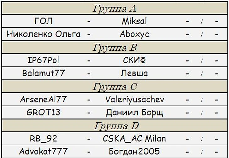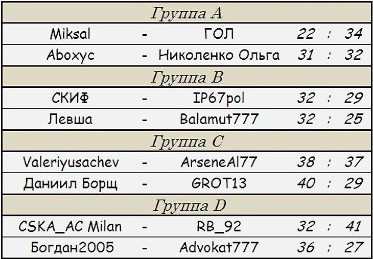 Есть и те, кто максимально усложнил себе жизнь: Николай Balamut777 проиграл все три матча. Плюс ко всему, его соперники поделили очки. Нужны победы, Николай! Очень нужны!