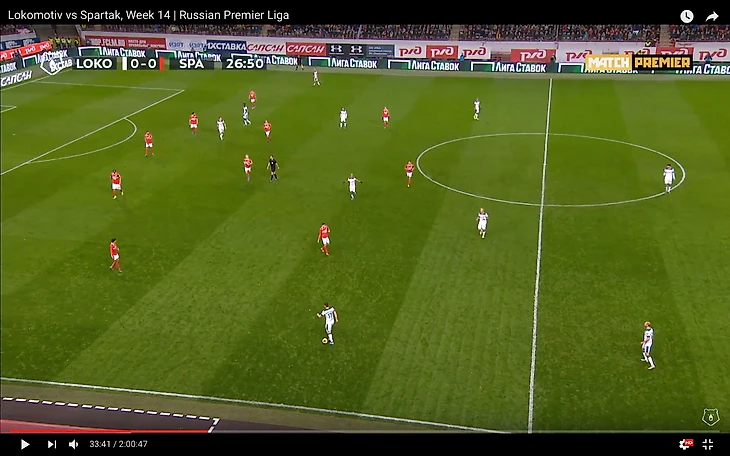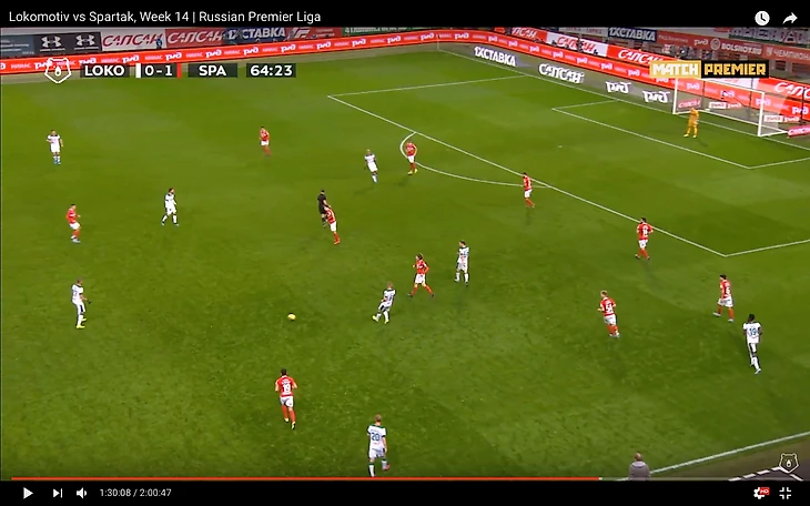 Второй тайм, контратака "Локомотива", "Спартак" находится в той же расстановке, которая была при атаке. Явно видна четверка защитников, Мельгарехо остался в атаке:
