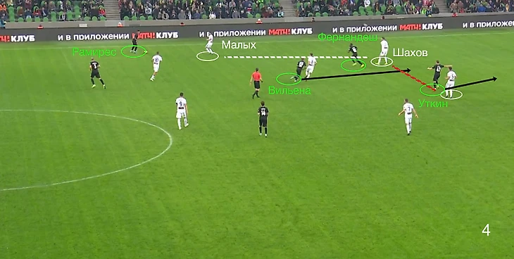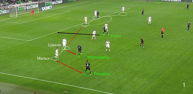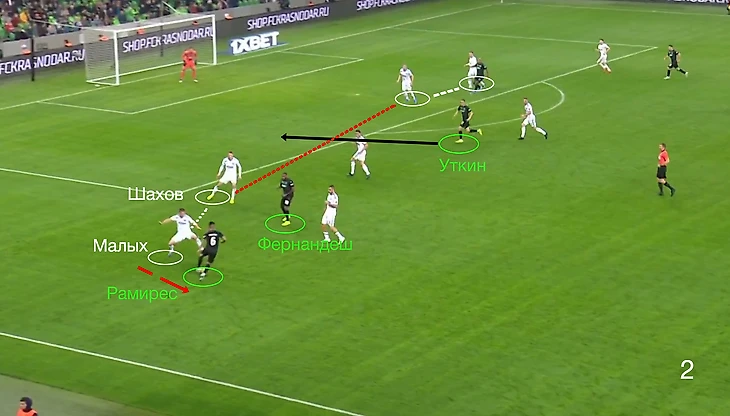 Когда Рамирес поднимался высоко на половину Оренбурга, его встречал латераль Малых, КЦЗ/Шахов в это же время переключался на Фернандеша. Из-за чего образовывался зазор между КЦЗ и ЦЦЗ, куда раз за разом нырял Уткин: