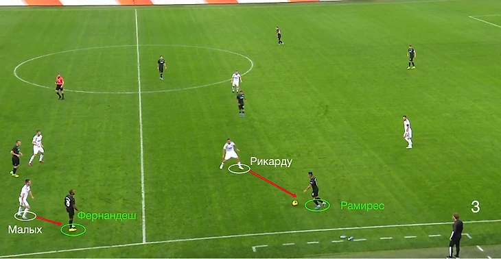 Тут важно отметить, что Рамиресу нужно было располагаться именно высоко. В низком расположении по нему играл Рикарду, а Малых контролировал в таком случае Фернандеша. КЦЗ оставался на своём месте: