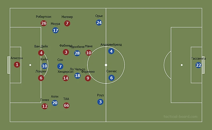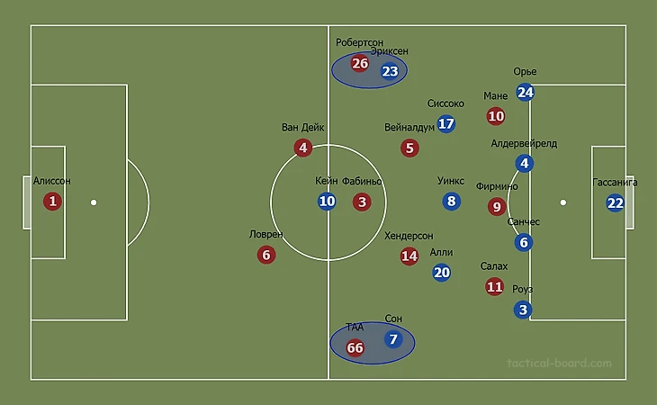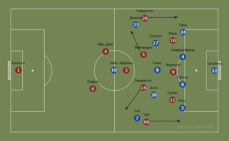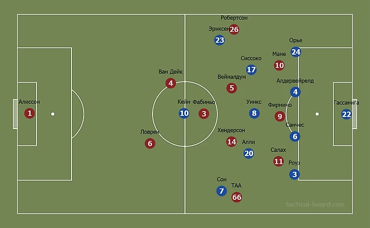 Ливерпуль играл большую часть матча по привычной схеме 4-3-3. Почеттино вернулся к 4-2-3-1 - основной схеме прошлого сезона. Но довольно быстро она перешла в 4-5-1, где на краях полузащиты играли Сон и Эриксен, который, видимо, должен был сдерживать Робертсона и отрабатывать в обороне.