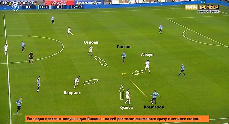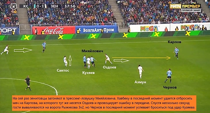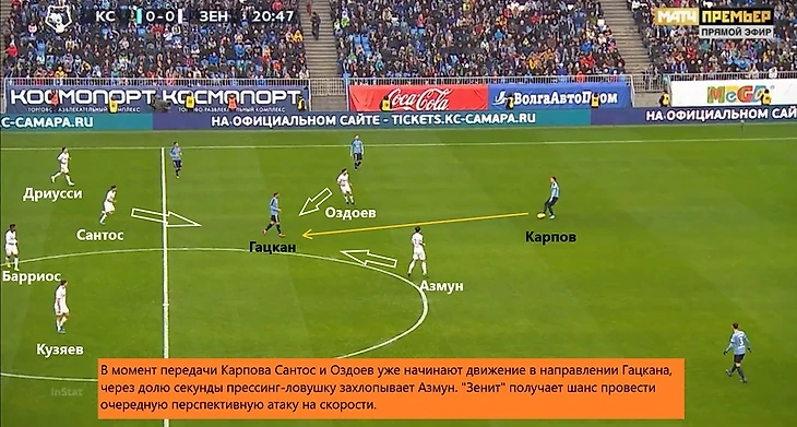 За счет активного движения Оздоева и Азмуна на передней линии «Зенит» в течение часа душил самарцев прессингом – 12 из 16 потерь хозяев на своей половине пришлись на этот отрезок. Вот несколько характерных примеров.