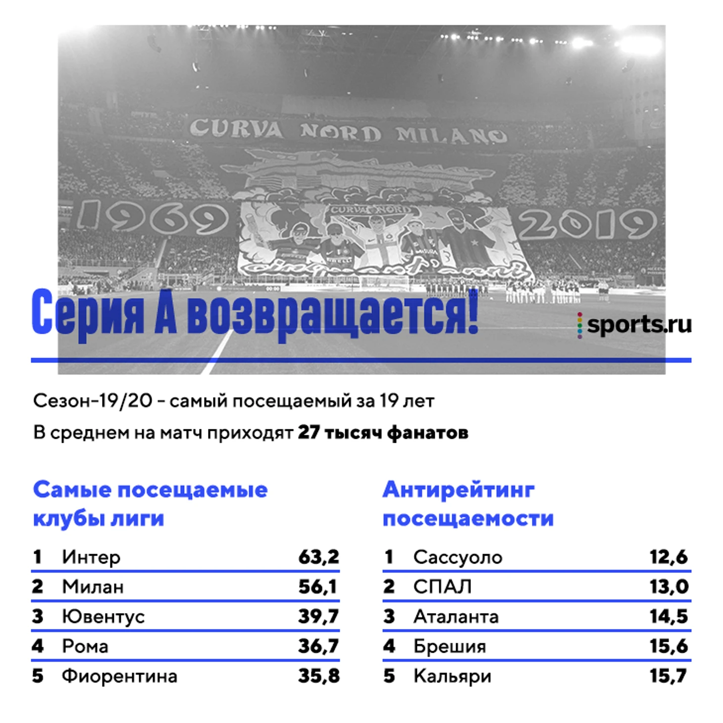 • «Интер» и «Милан», как известно, играют на одном и том же стадионе – легендарном «Сан-Сиро» вместительностью 80 тысяч. «Интер» опережает соседей по простой причине – лучше играет в футбол. При этом оба миланских клуба прибавили по сравнению с прошлым сезоном – «Интер» стал собирать больше на 3 тысячи человек, «Милан» – на две. Это отчасти поспособствовало общему росту посещаемости серии (в среднем посещаемость выросла на 2 тысячи, показатель сезона-18/19 – 25,1).