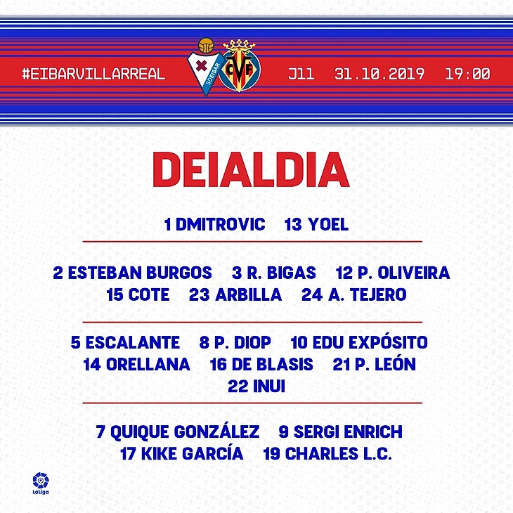 Хосе Луис вызвал на матч с «Вильярреалом» 19 футболистов. Серхио Альварес и Иван Рамис не помогут команде из-за травм. Рамис уже пропустил матч против «Вальядолида» и две тренировки, но, скорее всего, сможет вернуться в строй к игре с «Леганесом». Робер Корреа не вызван по решению тренерского штаба. В заявку вернулся Эстебан Бургос, который пока не играл за «Эйбар» в Примере, и Шарлес, пропустивший матч против «Вальядолида». Судя по тому, что в заявку включены все четыре форварда, Мендилибар сделает ставку на схему 4-4-2.