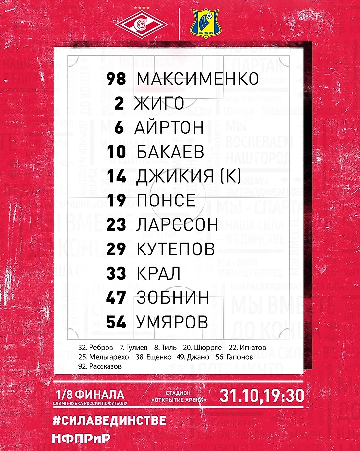 Стал известен состав красно-белых в домашнем матче 1/8 финала ОЛИМП — Кубка России против «Ростова».