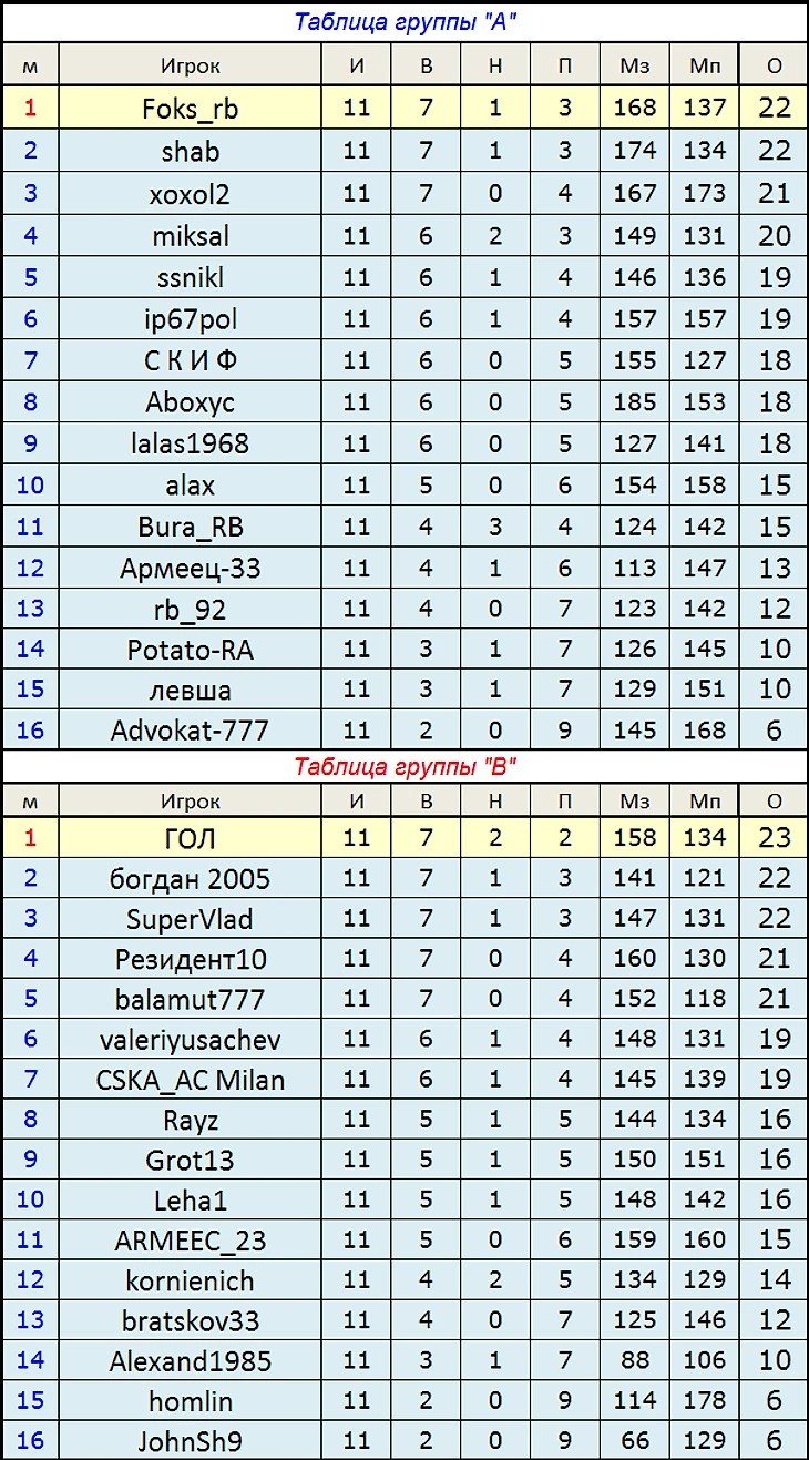 Таблицы групп (после 11 тура):