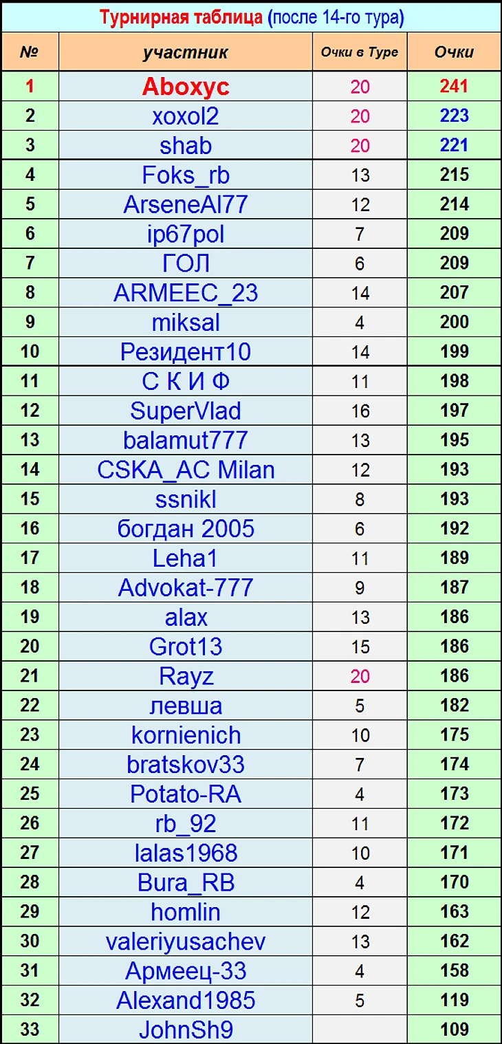 МВП 14-го Тура - Aboxyc, xoxol2, Rayz, shab - по 20 очков!