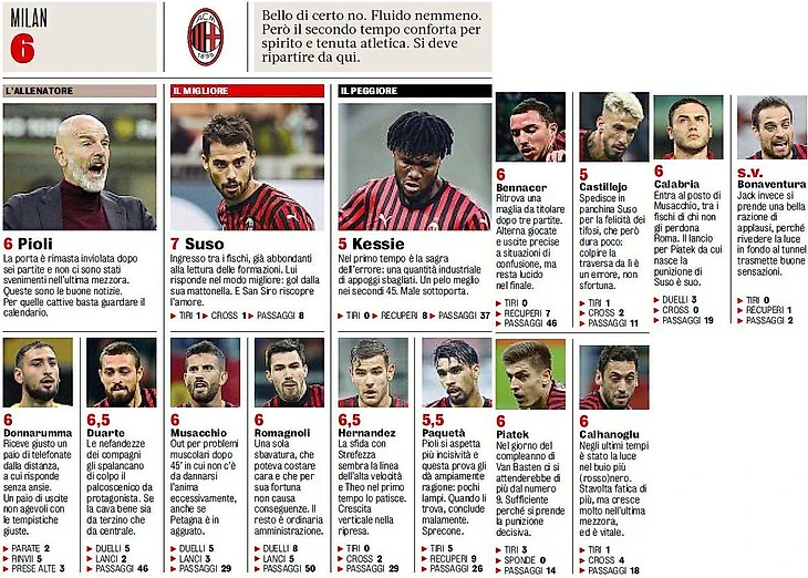 Итальянские издания оценили игру Милана довольно высоко, в особенности игру Сусо. Оценки GdS футболистам Милана