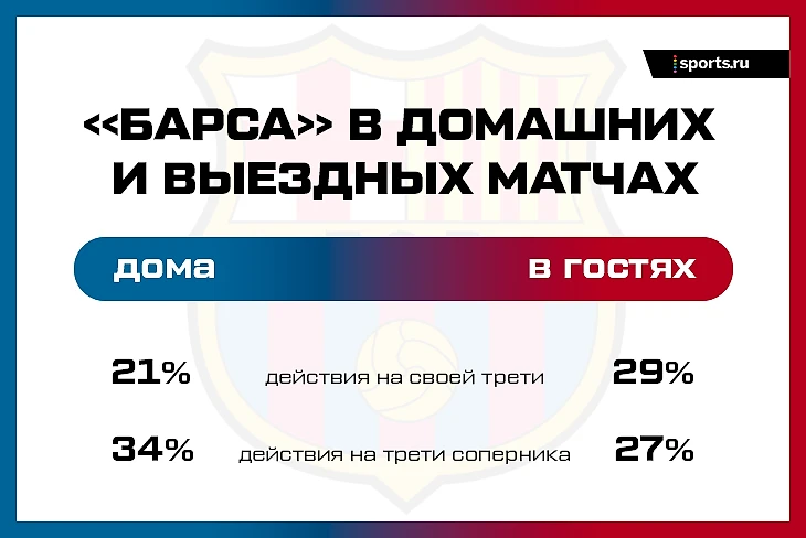 На выезде «Барса» намного больше времени проводит в попытках пройти чужой прессинг – даже больше, чем непосредственно в атаке. Возрастает риск ошибок, снижается нагрузка на соперника.
