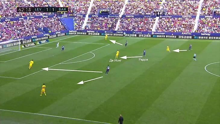 «Леванте» снова смело перекрывает все варианты в центральной зоне – и даже не боится оставить простор в опорной зоне (на Де Йонга выдвигается опорник Радоя). Этого достаточно, чтобы вынудить Тег Стегена выносить. Из этого придет второй мяч: