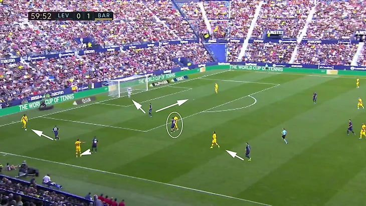 Во втором тайме на Френки Де Йонг (играл опорника у «Барсы») стал выдвигаться кто-то из опорников «Леванте» (Мелеро или Радоя). Остальные игроки поддерживали давление. Формально такой подход оставлял дыру в центре поля (Видаль, Артур плюс, возможно, Месси против всего одного опорника). На практике «Барса» не добиралась туда. Перед первым голом: