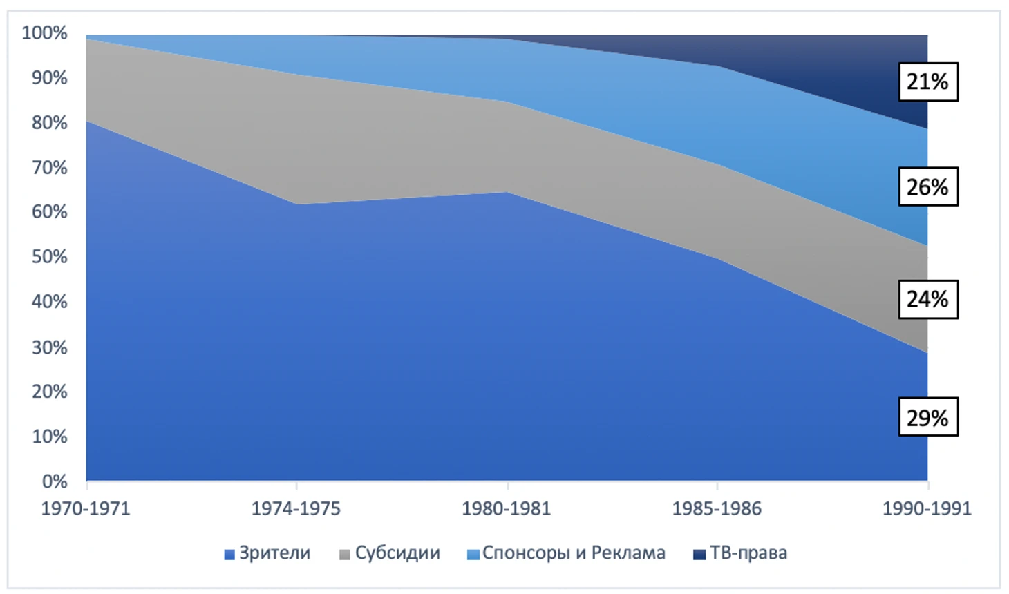 Еще в первой половине XX века рост популярности футбола привел к появлению полноценных профессиональных команд, требующих затрат на зарплаты игрокам и тренерам, инфраструктуру и участие в турнирах. Как следствие, сформировались два основных канала финансирования – продажи билетов и поддержка от государства, либо крупных компаний (именно тогда «собственные» клубы появились у Fiat, Phillips, Bayer и других). В послевоенные годы бум рекламного рынка захватил и футбол: бизнес заметил возможности, открываемые за счёт страстной поддержки клубов болельщиками, и был готов платить за рекламу своего бренда. Подобная модель сохранялась до середины 80-х, что отлично иллюстрируется на примере структуры доходов французских клубов.