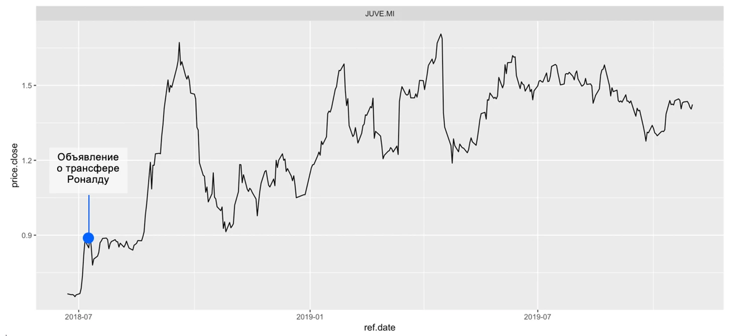 Не так давно Sport Connect оценивал финансовый эффект от покупки Ювентусом Криштиану Роналду. В частности, отмечался рост стоимости акций Юве более чем вдвое за прошедший год – факт, часто используемый как доказательство успешности приобретения португальца, но довольно спорный с чисто финансовой точки зрения. Оценивая «эффект Роналду» на курс акций клуба, можно руководствоваться двумя показателями: краткосрочными колебаниями (позволяющей оценить реакцию рынка на саму сделку) и долгосрочной динамикой, сложность интерпретации которой заключается в присутствии на горизонте одного-двух лет слишком большого числа факторов, большинство из которых не имеют прямого отношения к Криштиану.