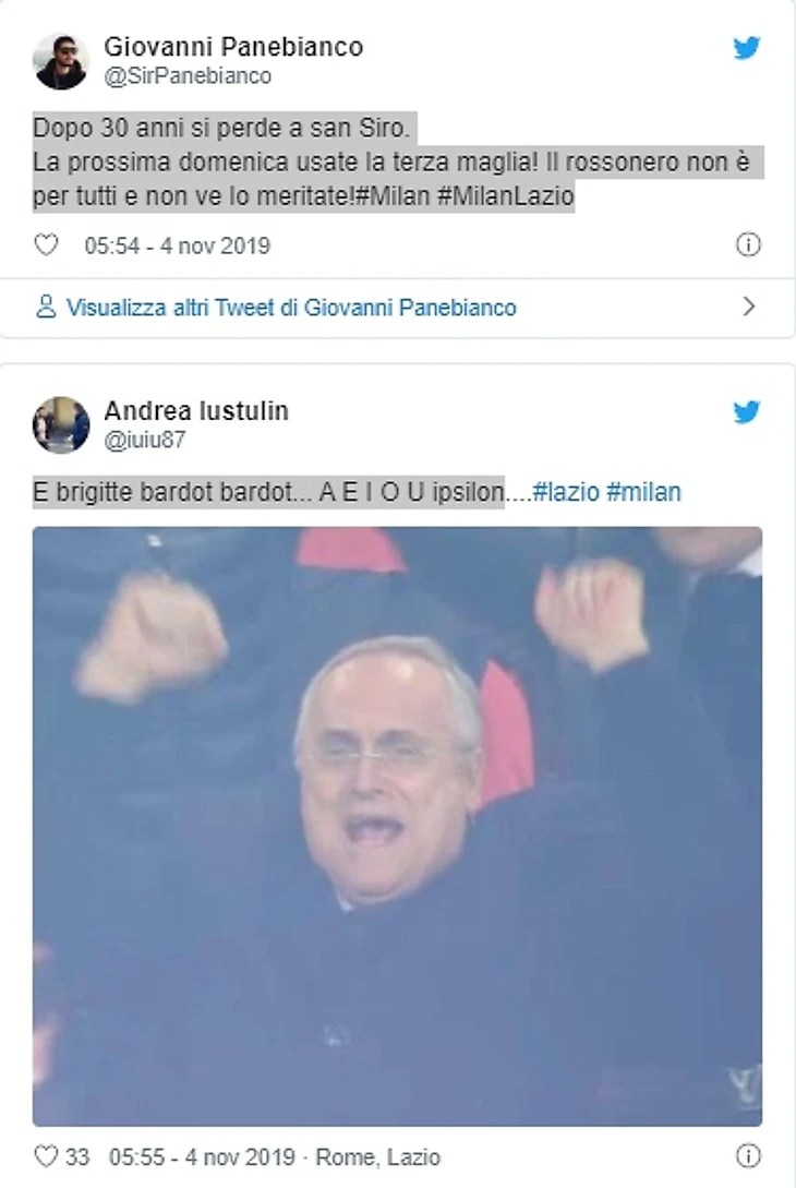 Giovanni Panebianco: 30 лет беспроигрышных игр [с "Лацио"] на Сан-Сиро окончены. В следующее воскресенье оденьте резервную форму. Красно-черные цвета не для всех, и вы явно их не заслуживаете #Milan #MilanLazio
