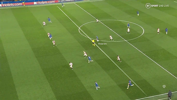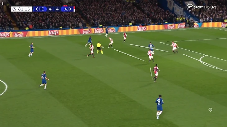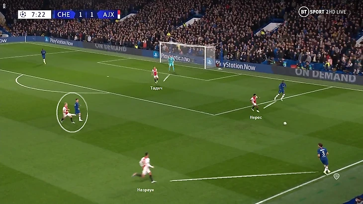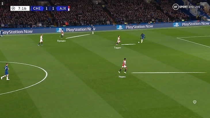 «Аякс» избрал очень интенсивную модель прессинга с четкими персональными ориентирами. Нерес и Тадич действовали по Зума и Томори. Промес и Назрауи – по Аспиликуэте и Алонсо. Зиеш и Мартинес не давали развернуться Ковачичу и Жоржиньо. Иногда Тадич шел прессинговать до вратаря – в этих случаях к прессингу подключался Тальяфико, делая его еще более рискованным.
