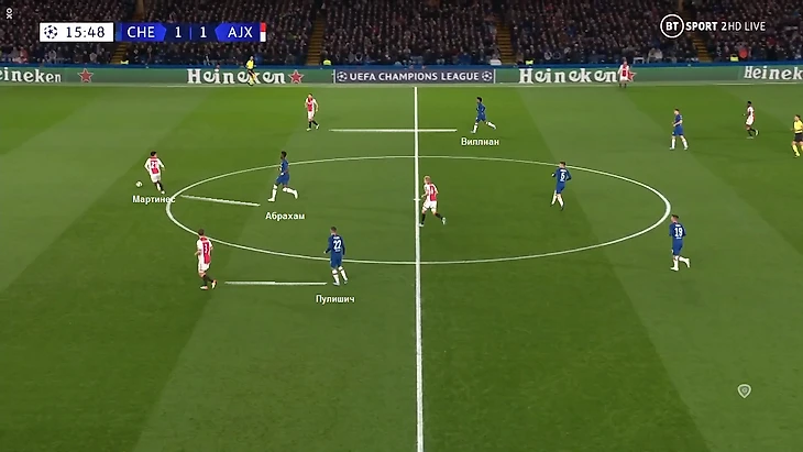 Здесь ключевую для «Аякса» роль сыграл Лисандро Мартинес. Аргентинец регулярно смещался на одну линию с Блиндом и Велтманом, чтобы помогать с продвижением и провоцировать прессинг передней линии «Челси». Абрахам, Пулишич и Виллиан выдвигались прессинговать 3-в-3 и создавали зазор между собой и центральной линией. Именно туда и отдавалась продвигающая передача.