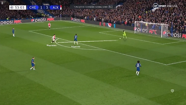 Раз за разом футболисты «Челси» грузили мяч на Абрахама – вместо того, чтобы, например, прострелить параллельно лицевой и найти абсолютно свободного партнера. Напомню, прикрывать эту зону у «Аякса» было некому.