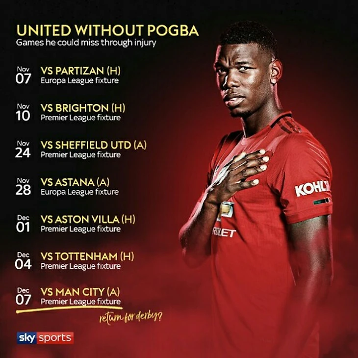 Sky Sports собрали интересную инфографику на основании слухов о здоровье полузащитника «Манчестер Юнайтед» Поля Погба. Судя по всему, француз вернется на поле не раньше декабря и может порадовать фанатов только в дерби с «Манчестер Сити».