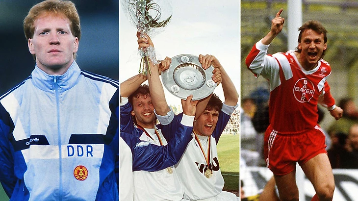 Слева направо: Маттиас Заммер в форме сборной ГДР; футболисты "Ганзы" - чемпионы последнего сезона Оберлиги; звезда восточногерманского футбола, форвард Андреас Том в форме леверкузенского "Байера".