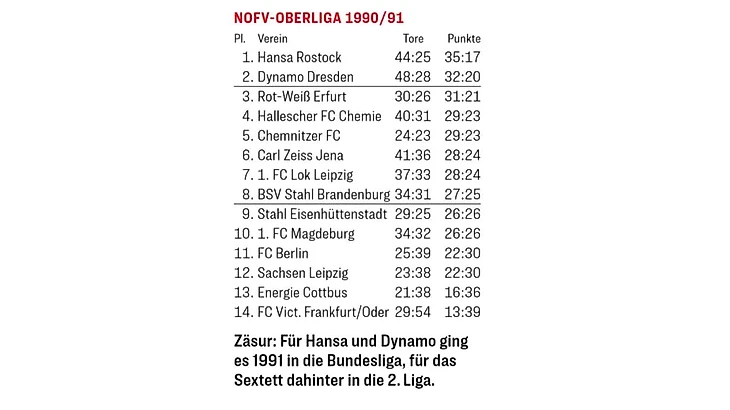 Два лучших клуба последнего чемпионата ГДР перешли в первую бундеслигу, шесть следующих во вторую бундеслигу. Остальные перешли в третий дивизион. Началось погружение в суровую реальность капиталистического футбола.