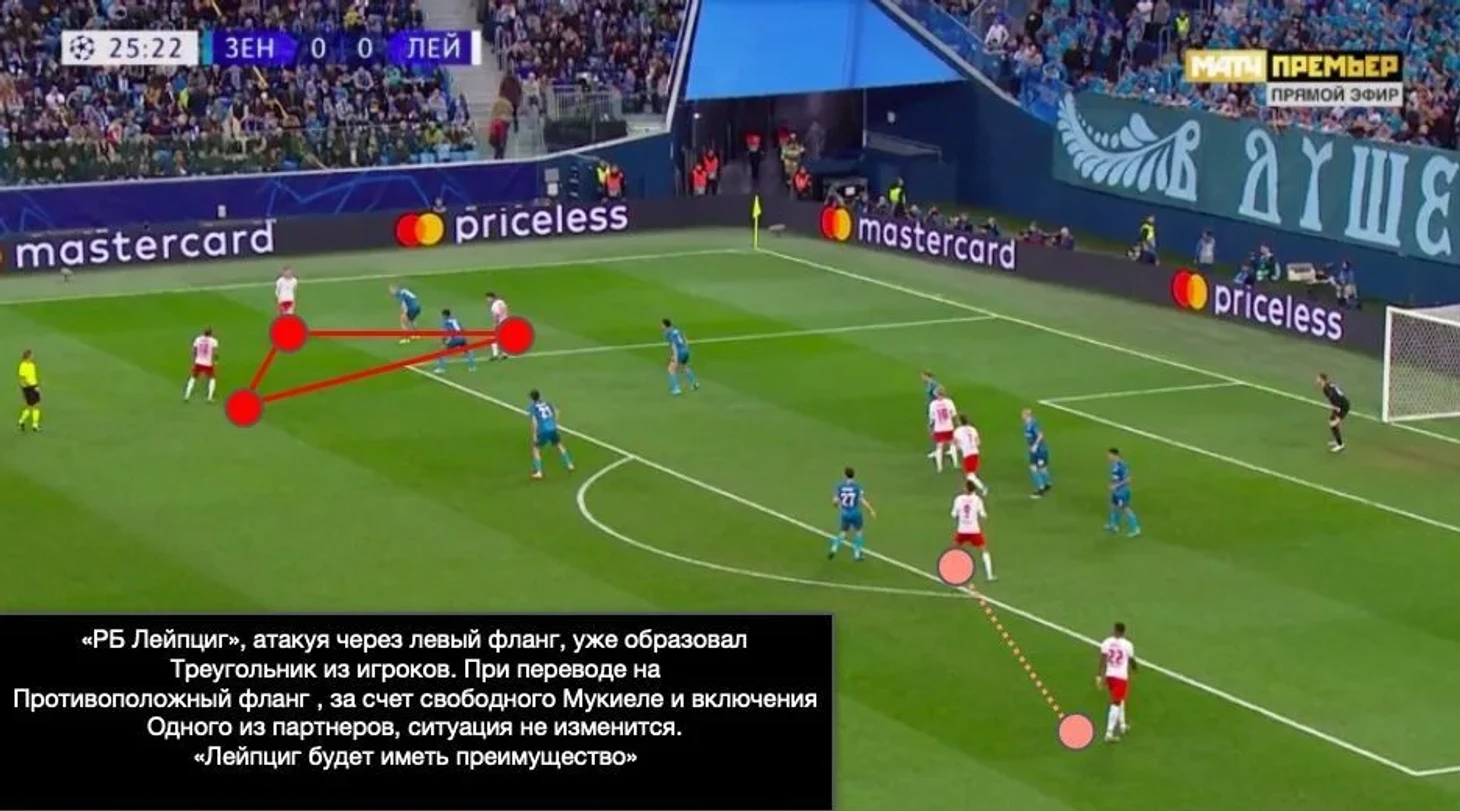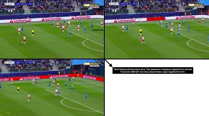Вкупе с розыгрышем мяча немцами на третьего и необходимостью включения в эпизод одного из центральных полузащитников «Зениту» катастрофически не хватало дополнительного игрока в центре. «РБ» в свою очередь умышленно создавал ситуации 3v2, 4v3.