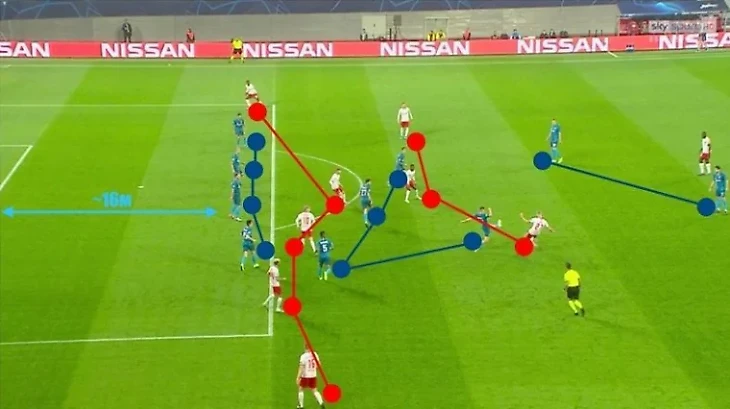 Футболисты «Лейпцига» прекрасно обучены компактному командному движению, предполагающему организацию своеобразных треугольников и квадратов, позволяющих загнать соперника в наименее комфортные зоны для продвижения мяча, если до этого не получилось совершить отбор.