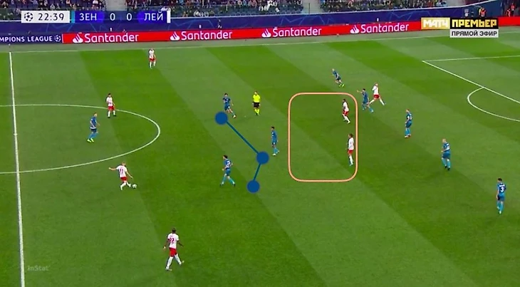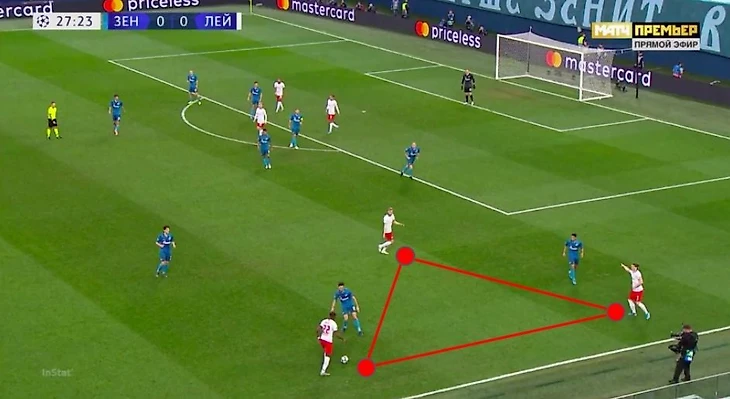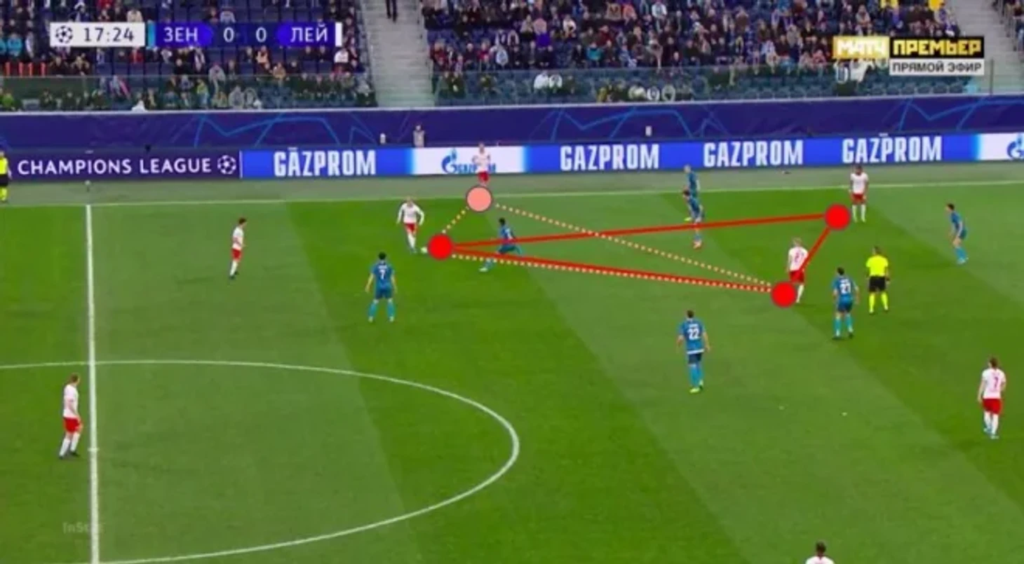 «Зениту» критично не хватало дополнительного игрока в центре поля, «РБ» этим пользовался. Весь матч «быки» создавали ситуации с «треугольным» расположением игроков.