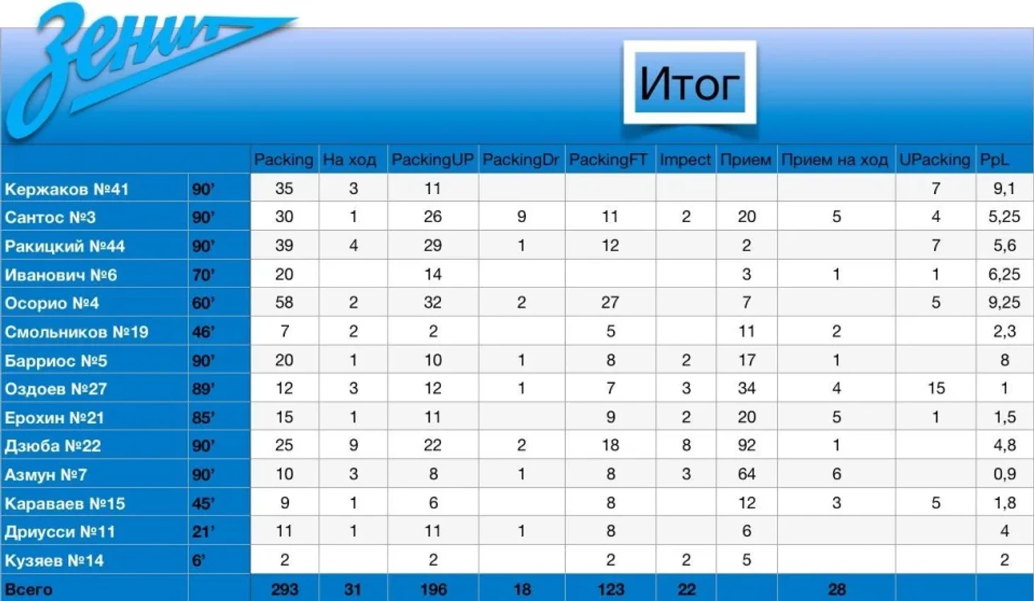 Здесь же характерно выделяются и цифры Packing Per Loss (пакинг на потерю). За исключением Дзюбы зенитовцы теряли мяч значительно чаще, чем в РПЛ. Сказывались совсем иные скорости, уровень и давление. Что интересно, тройка центральных защитников и Сантос при сравнительно высоком давлении продвигала мяч на высоком уровне. Меньшем, чем Упамекано с Клостерманом, попадавших под прессинг куда реже, меньшем, чем в чемпионате России, но по-прежнему достаточном для уровня еврокубков.