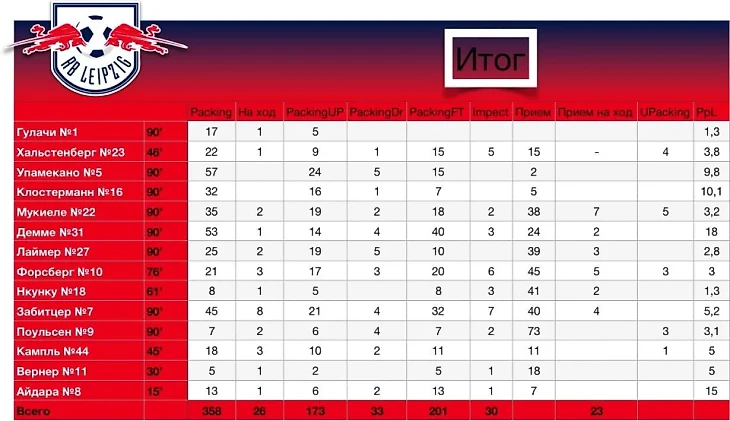 В сравнении с «Зенитом» «РБ» тоже довольно часто ошибался в передачах, но и продвигал мяч значительно активнее — в финальной трети более чем в полтора раза больше соперников оказалось «отрезано» от линии мяча.