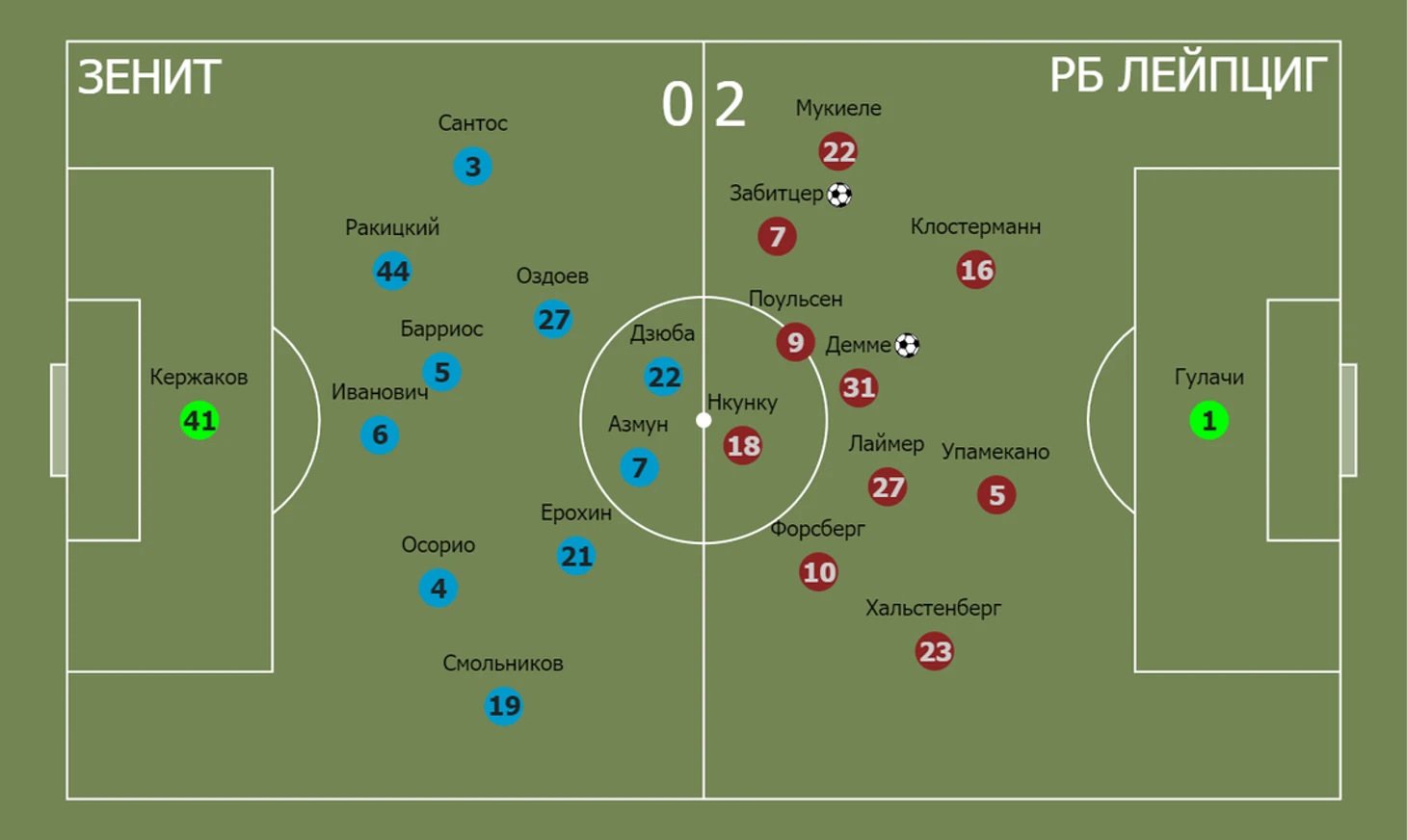 Если в первой встрече в середине октября в Лейпциге тренерский штаб к удивлению многих предпочел играть с четверкой защитников, что, учитывая изъяны оборонительной игры Дриусси и матч-менеджмент Нагельсмана, вылилось в большие проблемы на левом фланге обороны «Зенита», то в домашней встрече Сергей Семак, ожидая усиленное давление немцев, вернулся к расстановке с пятью защитниками, уже опробованной в матчах ранее, выпустив в стартовом составе Смольникова и Осорио.
