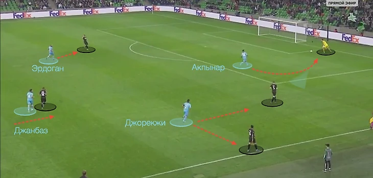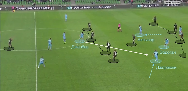 Акпынар смещается в глубину с позиции центрфорварда. Джорекжи насыщает центральную зону с фланга. Три игрока гостей в перспективных позициях.