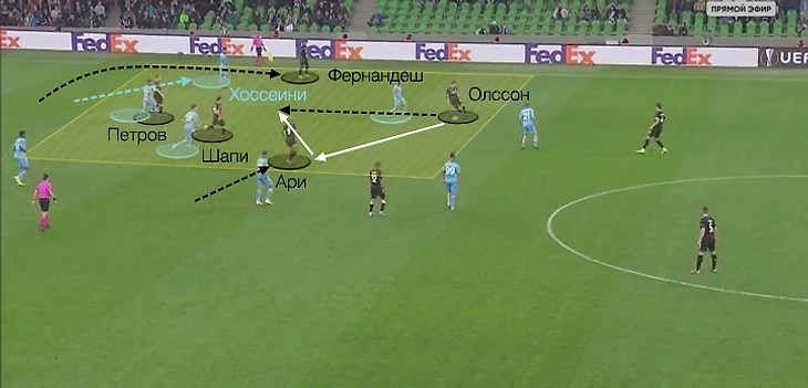 Ману уводит своего опекуна Хоссейни глубоко на правый фланг. «Краснодар» перегружает полуфланг за счёт смещения Ари и через несколько «стеночек» доводит до удара Олссона из пределов штрафной.
