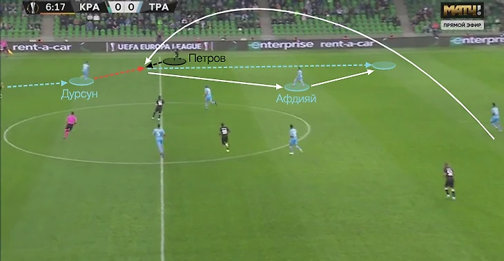 Дурсун сделал рывок со своей трети поля, где находился рядом с Шапи. Сулейманов рывок не поддержал, и турецкий фулбек выполнил неприятный кросс без сопротивления на дальнюю штангу.